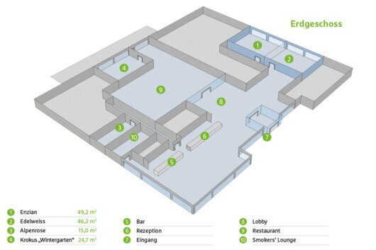 Die Tagungsräume Enzian und Edelweiss befinden sich rechts vom Eingang/der Lobby
